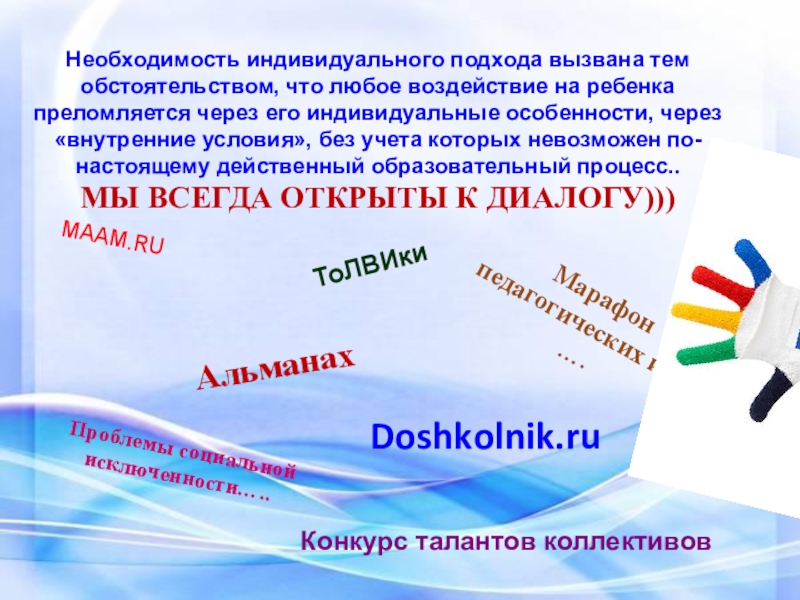 Это сайт презентаций, где можно хранить и обмениваться своими презентациями, докладами, проектами, шаблонами в формате PowerPoint с другими пользователями. Мы помогаем школьникам, студентам, учителям, преподавателям хранить и обмениваться учебными материалами.