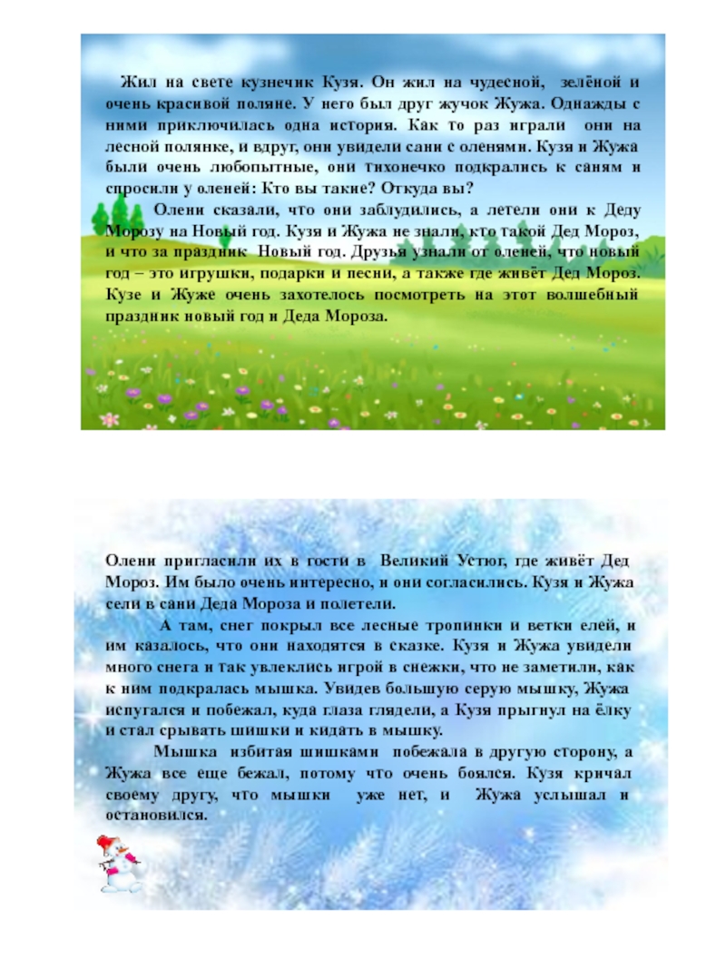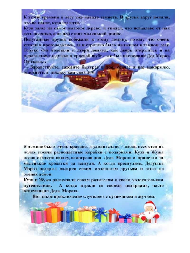 В домике было очень красиво, и удивительно – вдоль всех стен на полах стояли разноцветные коробки с подарками. Кузя и Жужа поели сладкую кашку, осмотрели дом Деда Мороза и прилегли на маленькие кроватки да заснули. А когда проснулись, Дедушка Мороз подарил подарки своим маленьким друзьям и отвез на оленях домой.
