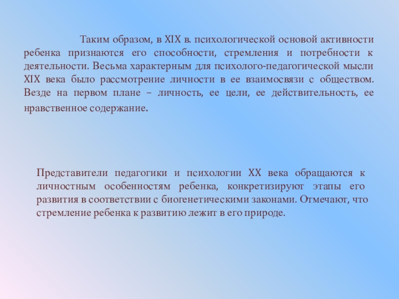 Представители педагогики и психологии XX века обращаются к личностным особенностям ребенка, конкретизируют этапы его развития в соответствии с биогенетическими законами. Отмечают, что стремление ребенка к развитию лежит в его природе.