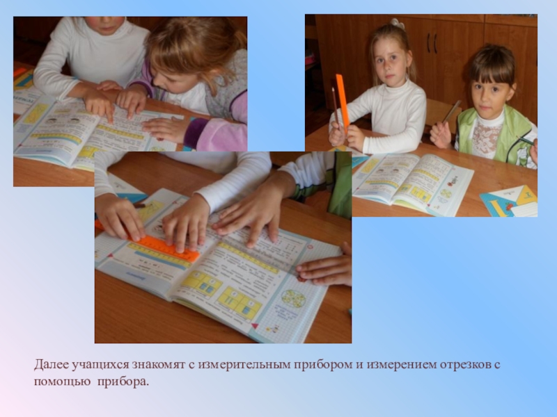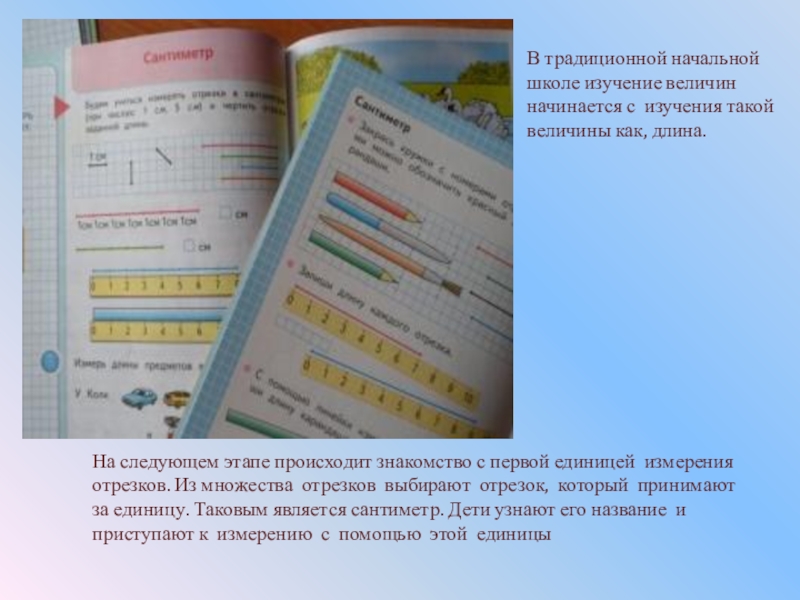 На следующем этапе происходит знакомство с первой единицей измерения отрезков. Из множества отрезков выбирают отрезок, который принимают за единицу. Таковым является сантиметр. Дети узнают его название и приступают к измерению с помощью этой единицы