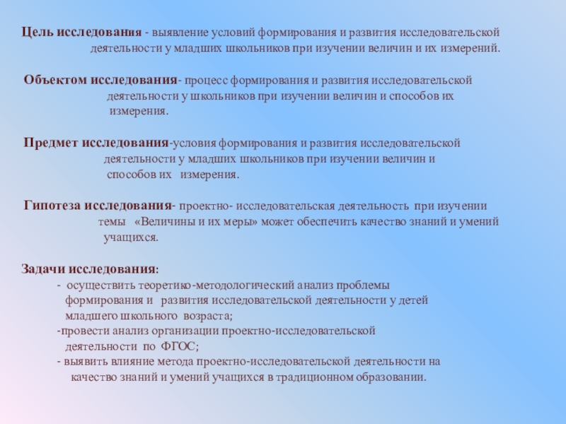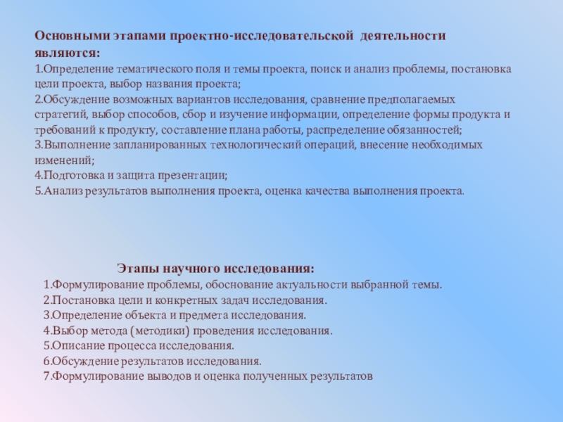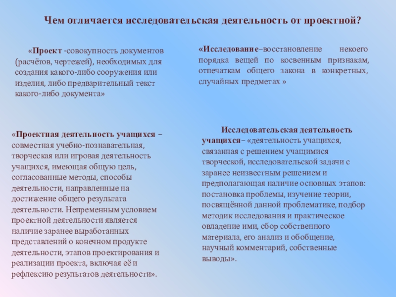 Исследовательская деятельность учащихся– «деятельность учащихся, связанная с решением учащимися творческой, исследовательской задачи с заранее неизвестным решением и предполагающая наличие основных этапов: постановка проблемы, изучение теории, посвящённой данной проблематике, подбор методик исследования и практическое овладение ими, сбор собственного материала, его анализ и обобщение, научный комментарий, собственные выводы».