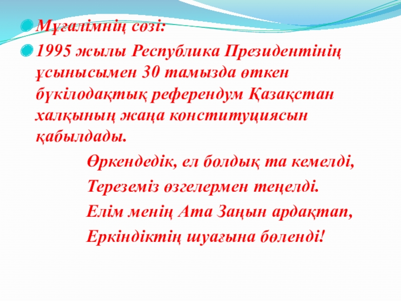 12- оқушы. 1995 жылы 30 тамызда Ата Заңымыз бірауыздан қабылданды.