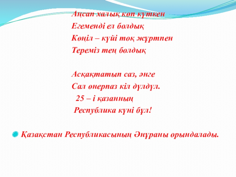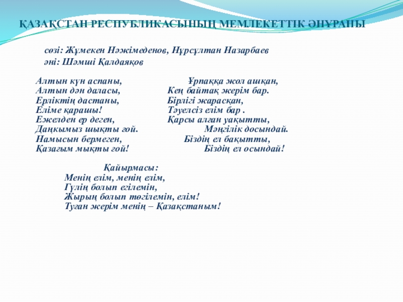 Слайд 8ҚАЗАҚСТАН РЕСПУБЛИКАСЫНЫҢ МЕМЛЕКЕТТІК ӘНҰРАНЫ