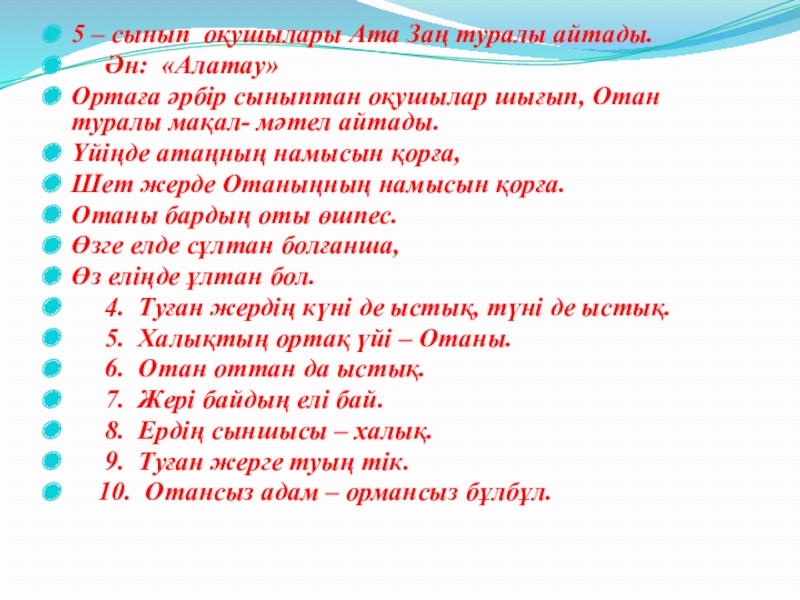 Ортаға әрбір сыныптан оқушылар шығып, Отан туралы мақал- мәтел айтады.