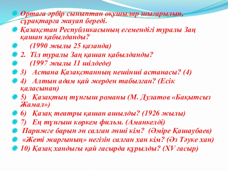 Слайд 18Ортаға әрбір сыныптан оқушылар шығарылып, сұрақтарға жауап береді.
