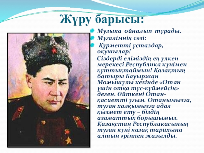 ең үлкен мерекесі Республика күнімен құттықтаймын! Қазақтың батыры Бауыржан Момышұлы кезінде «Отан үшін отқа түс-күймейсің» деген. Өйткені Отан- қасиетті ұғым. Отанымызға, туған халқымызға адал қызмет ету – біздің азаматтық борышымыз. Қазақстан Республикасының туған күні қазақ тарихына алтын әріппен жазылды.