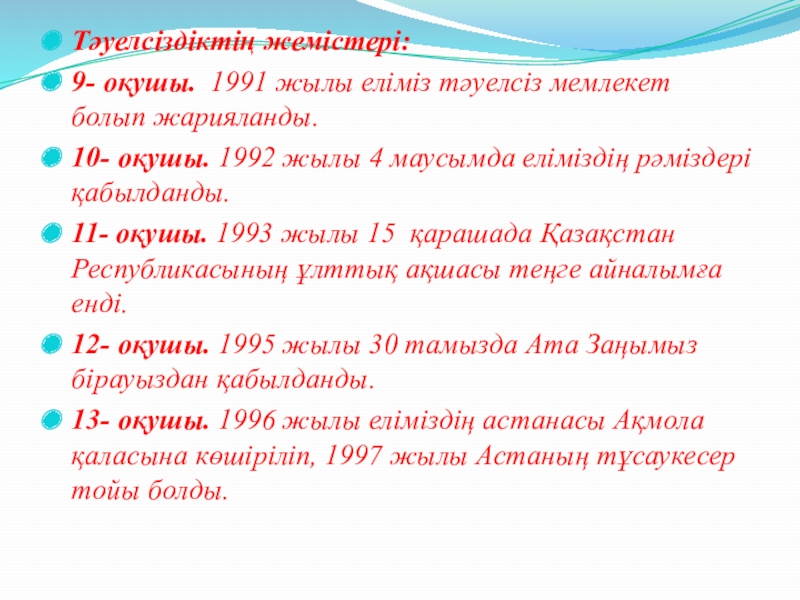 9- оқушы. 1991 жылы еліміз тәуелсіз мемлекет болып жарияланды.