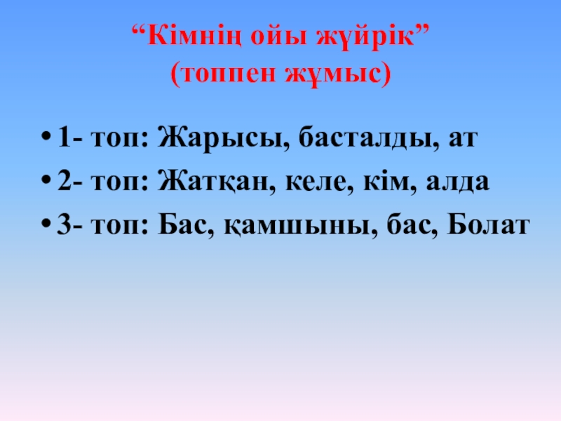 “Кімнің ойы жүйрік” (топпен жұмыс)1- топ: Жарысы, басталды, ат2- топ: Жатқан, келе, кім, алда3- топ: Бас, қамшыны,