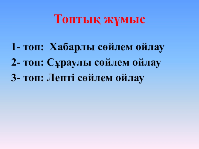Топтық жұмыс1- топ: Хабарлы сөйлем ойлау2- топ: Сұраулы сөйлем ойлау3- топ: Лепті сөйлем ойлау