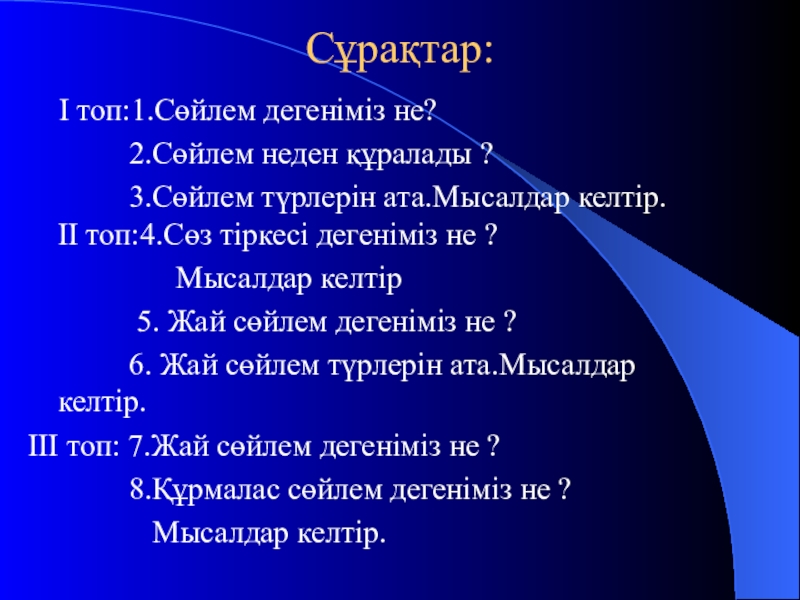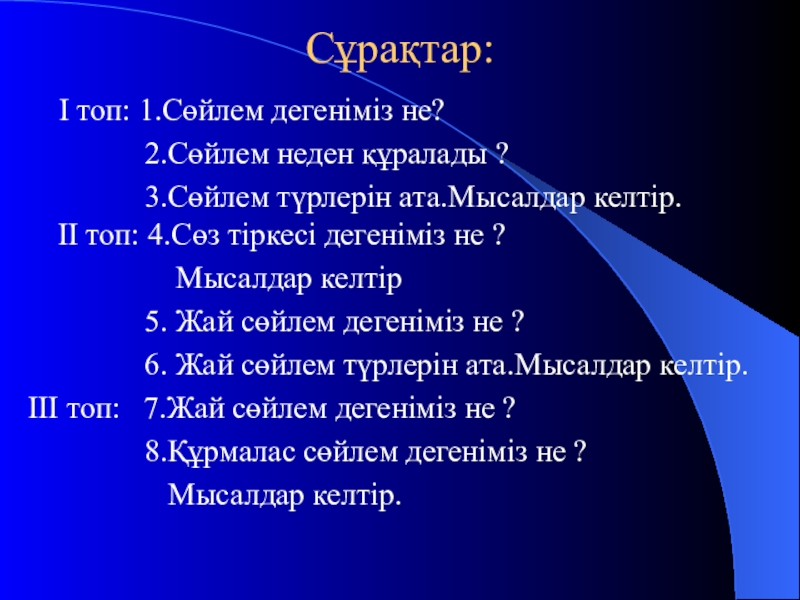3.Сөйлем түрлерін ата.Мысалдар келтір. ІІ топ:4.Сөз тіркесі дегеніміз не ?