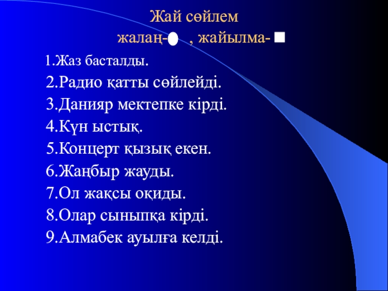 6. Жай сөйлем түрлерін ата.Мысалдар келтір.