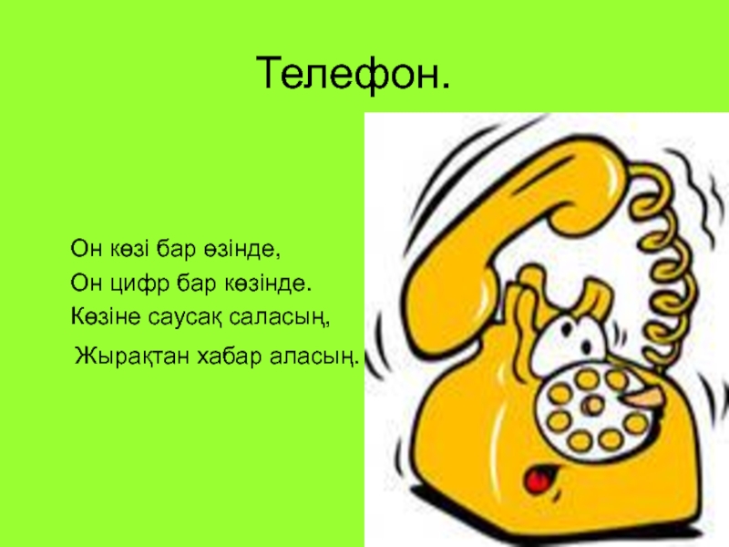 Телефон.   Он көзі бар өзінде,  Он цифр бар көзінде.  Көзіне саусақ саласың,
