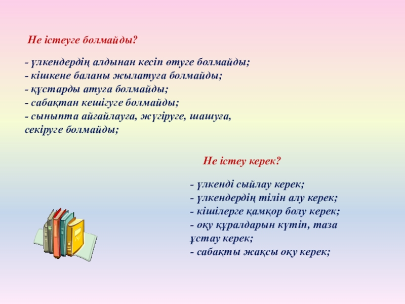 - сыныпта айғайлауға, жүгіруге, шашуға, секіруге болмайды;