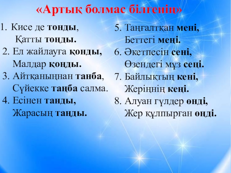 Кисе де тонды,   Қатты тоңды.2. Ел жайлауға қонды,  Малдар қоңды.3. Айтқаныңнан танба,