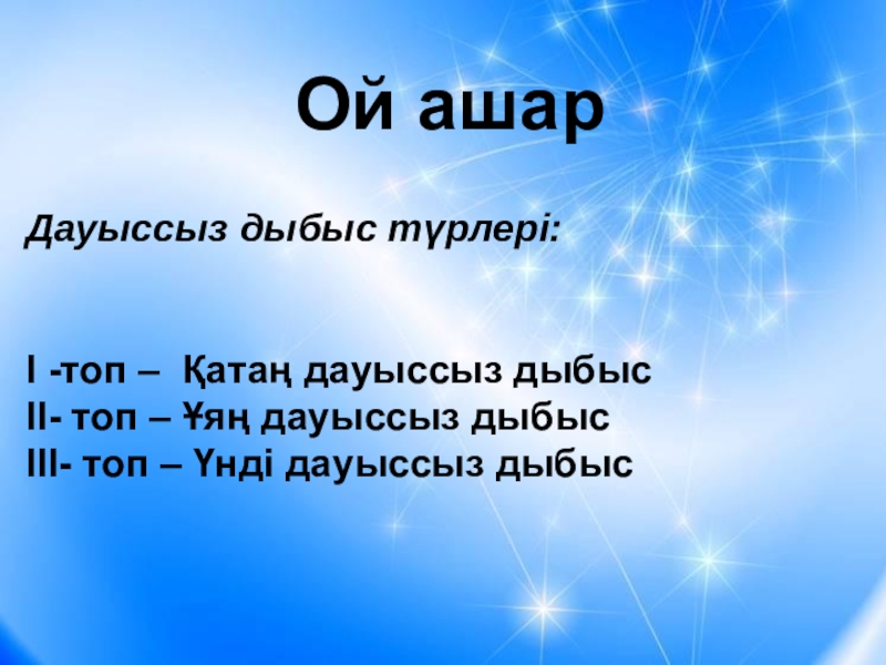 Ой ашарДауыссыз дыбыс түрлері:І -топ – Қатаң дауыссыз дыбысІІ- топ – Ұяң дауыссыз дыбысІІІ- топ – Үнді