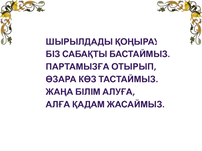 Шырылдады қоңырауБіз сабақты бастаймыз.Партамызға отырып,Өзара көз тастаймыз.Жаңа білім алуға,Алға қадам жасаймыз.