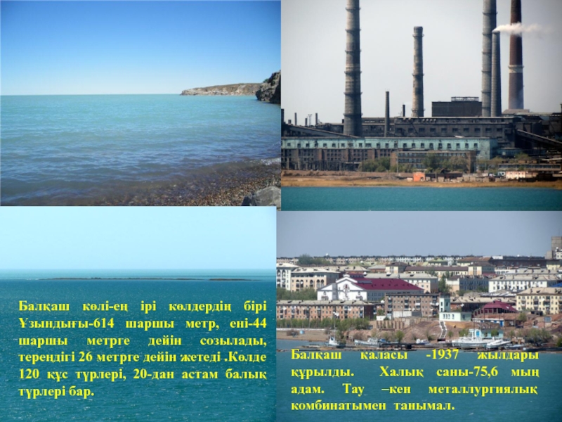 Балқаш қаласы -1937 жылдары құрылды. Халық саны-75,6 мың адам. Тау –кен металлургиялық комбинатымен танымал.