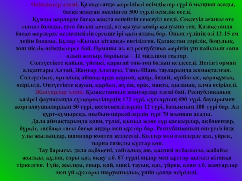 Слайд 3Өсімдіктер әлемі. Қазақстанда жергілікті өсімдіктер түрі 6 мыңнан асады, басқа жақтан