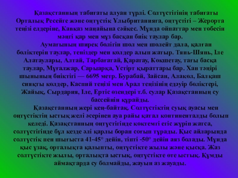 Слайд 2Қазақстанның табиғаты алуан түрлі. Солтүстігінің табиғаты Орталық Ресейге және оңтүстік Ұлыбританияға,