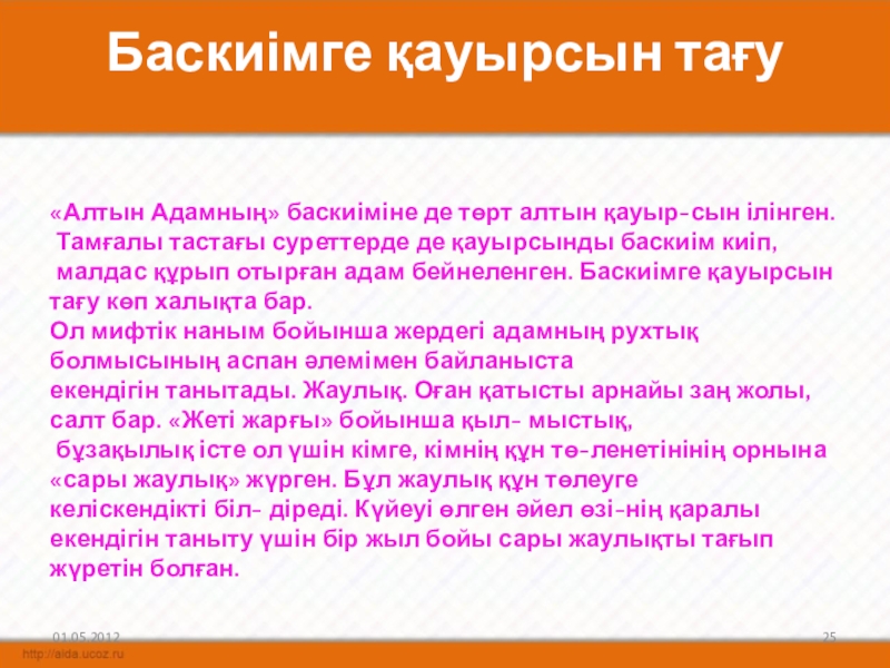 «Алтын Адамның» баскиіміне де төрт алтын қауыр-сын ілінген.