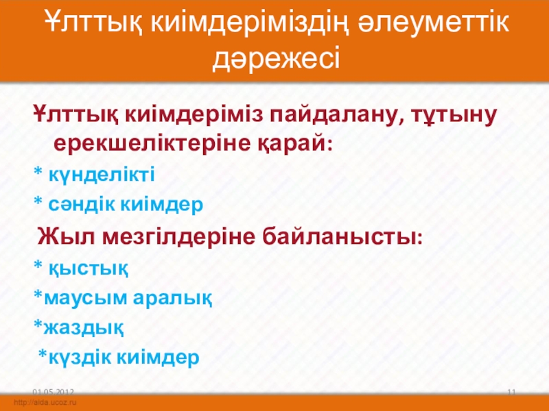 Слайд 11Ұлттық киімдеріміз пайдалану, тұтыну ерекшеліктеріне қарай: