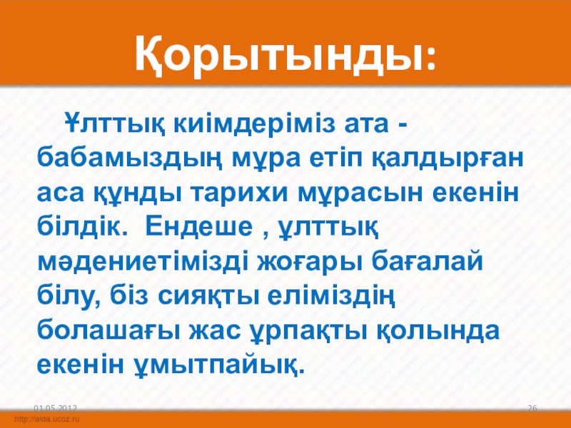 қалдырған аса құнды тарихи мұрасын екенін білдік. Ендеше , ұлттық мәдениетімізді жоғары бағалай білу, біз сияқты еліміздің болашағы жас ұрпақты қолында екенін ұмытпайық.