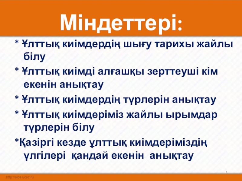 * Ұлттық киімдердің шығу тарихы жайлы білу