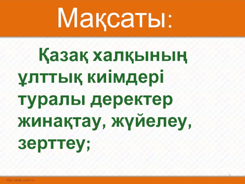 Қазақ халқының ұлттық киімдері туралы деректер жинақтау, жүйелеу, зерттеу;