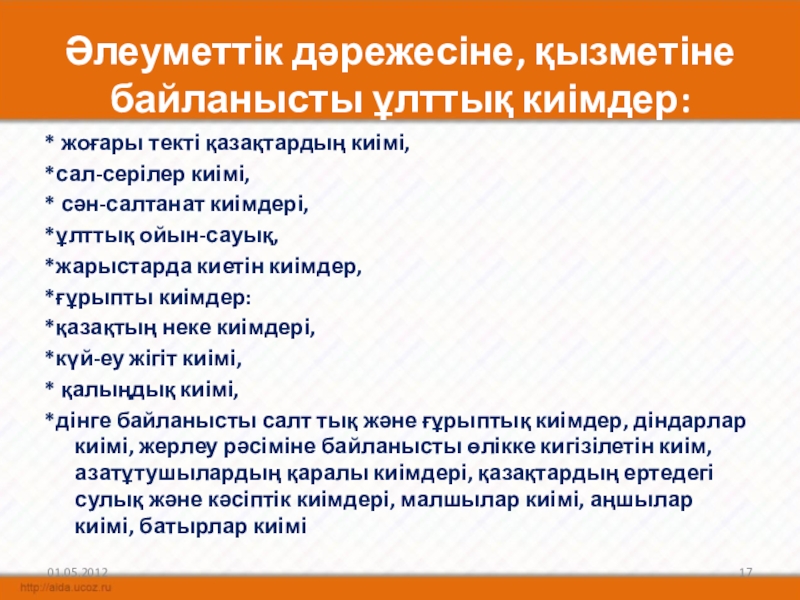 Слайд 17Әлеуметтік дәрежесіне, қызметіне байланысты ұлттық киімдер: