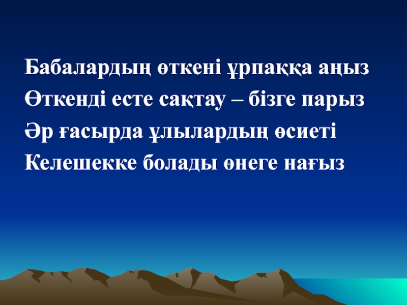 Бабалардың өткені ұрпаққа аңыз Өткенді есте сақтау – бізге парыз Әр ғасырда ұлылардың өсиеті Келешекке болады өнеге
