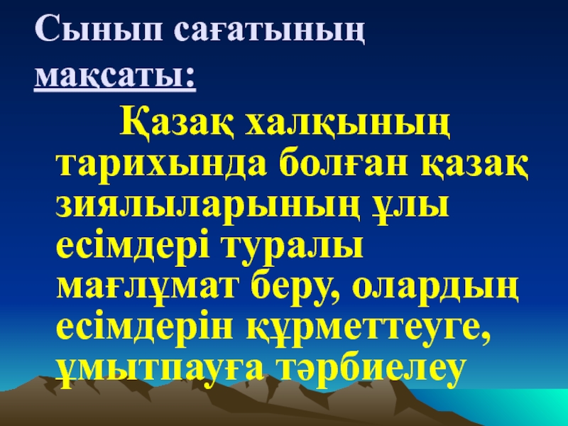 Сынып сағатының мақсаты: Қазақ халқының тарихында болған қазақ зиялыларының ұлы есімдері туралы мағлұмат беру, олардың есімдерін құрметтеуге, ұмытпауға тәрбиелеу