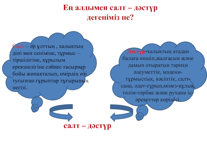 Дәстүр-халықтың атадан балаға көшіп,жалғасын және дамып отыратын тарихи әлеуметтік, мәдени-тұрмыстық, кәсіптік, салт-сана, әдет-ғұрып,мінез-құлық,тәлім-тәрбие және рухани іс-әрекеттер көрінісі.