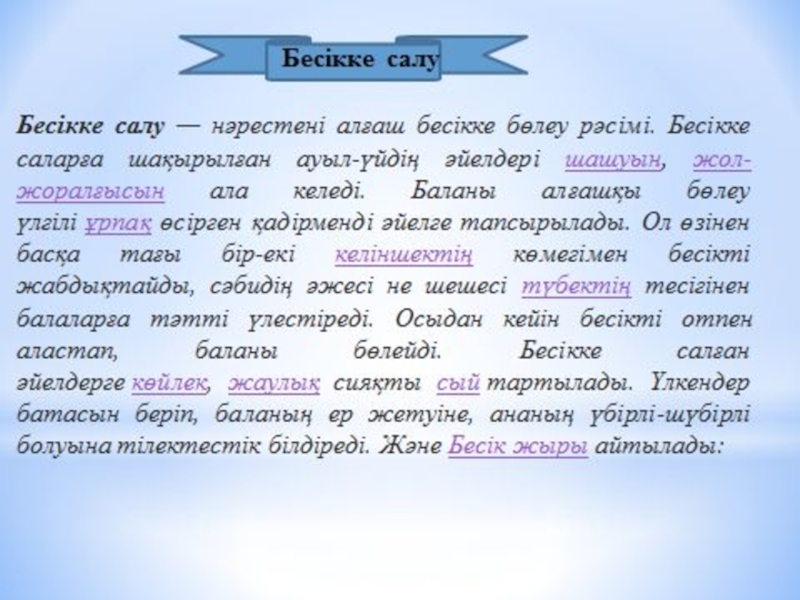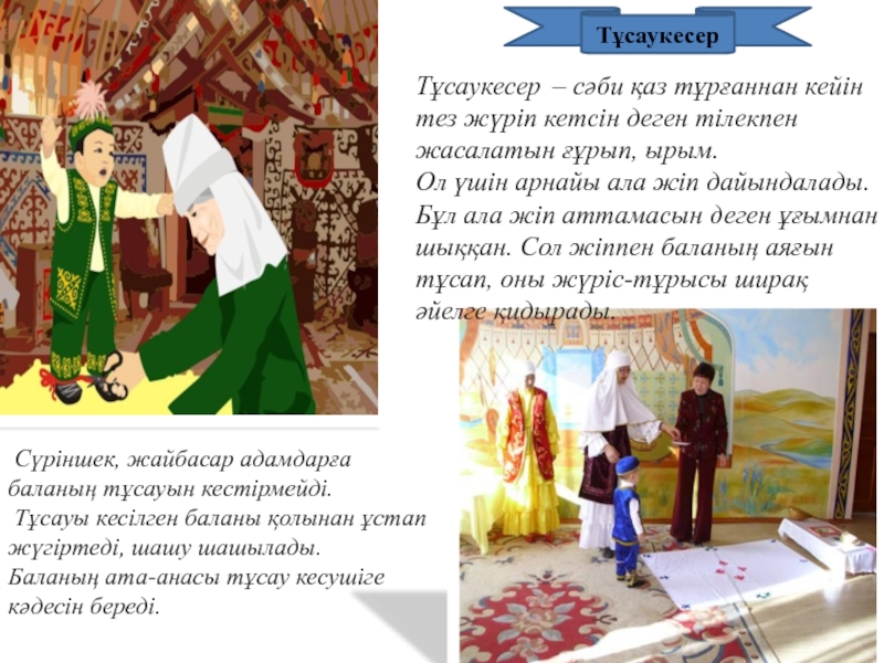 Тұсауы кесілген баланы қолынан ұстап жүгіртеді, шашу шашылады.