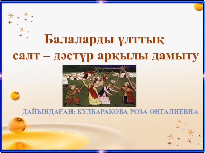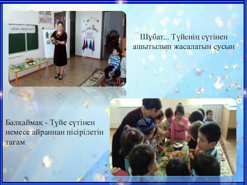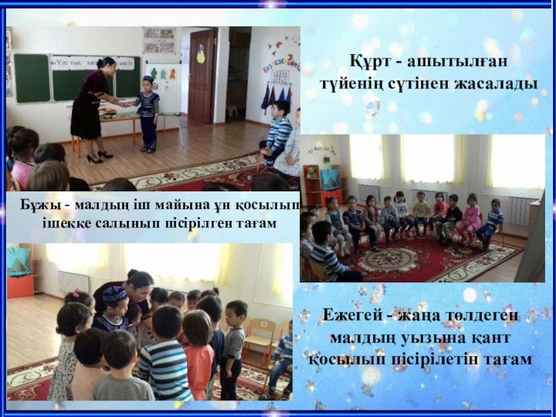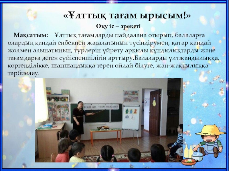 Мақсатым: Ұлттық тағамдарды пайдалана отырып, балаларға олардың қандай еңбекпен жасалатынын түсіндірумен, қатар қандай жолмен алынатынын, түрлерін үйрету арқылы құндылықтарды және тағамдарға деген сүйіспеншілігін арттыру.Балаларды ұлтжандылыққа, көргенділікке, шапшаңдыққа терең ойлай білуге, жан-жақтылыққа тәрбиелеу.