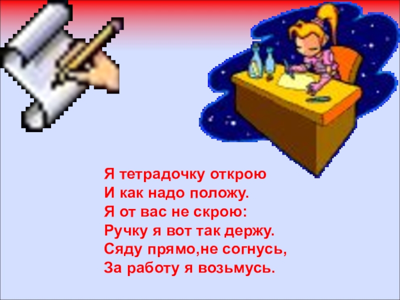 Я тетрадочку открою И как надо положу.Я от вас не скрою: Ручку я вот так держу.Сяду прямо,не
