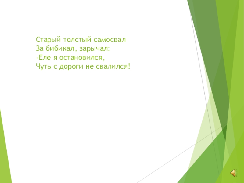 Слайд 12Старый толстый самосвал За бибикал, зарычал: -Еле я остановился, Чуть с дороги не свалился!