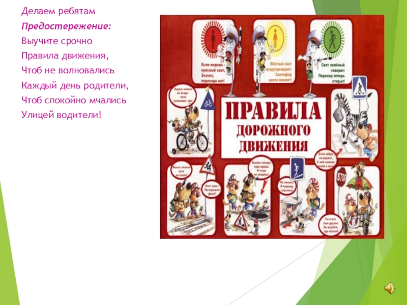 Делаем ребятамПредостережение:Выучите срочноПравила движения,Чтоб не волновалисьКаждый день родители, Чтоб спокойно мчалисьУлицей водители!