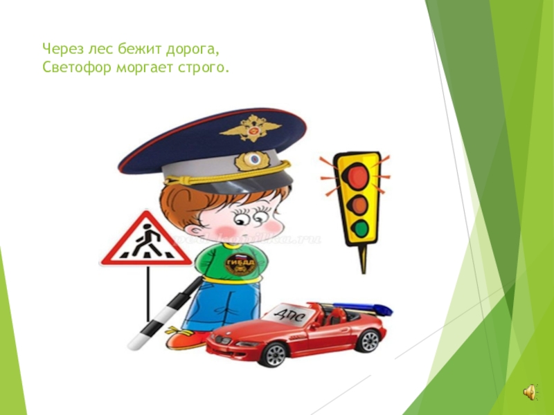 Слайд 2Через лес бежит дорога, Светофор моргает строго.