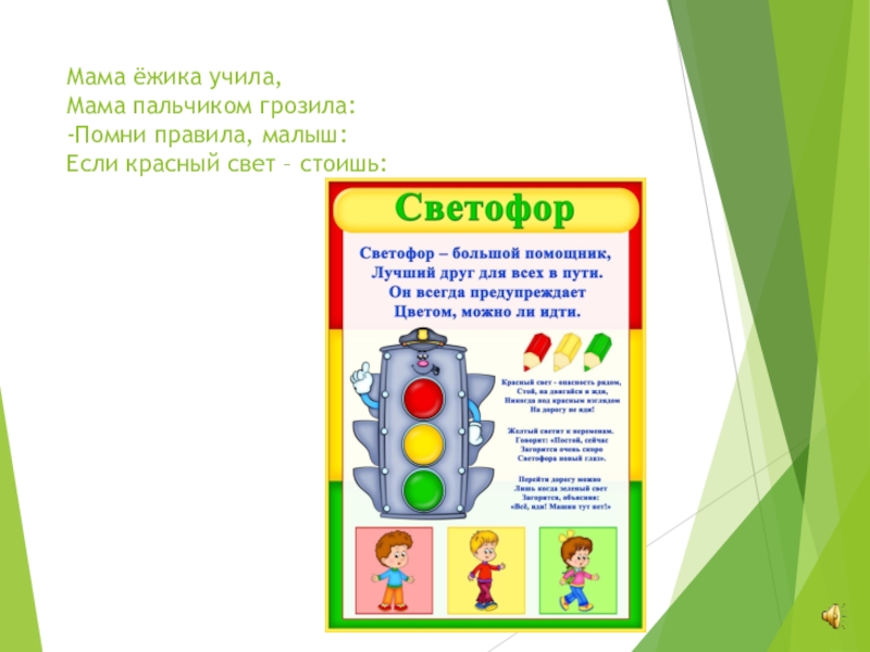 Мама ёжика учила, Мама пальчиком грозила: -Помни правила, малыш: Если красный свет – стоишь: