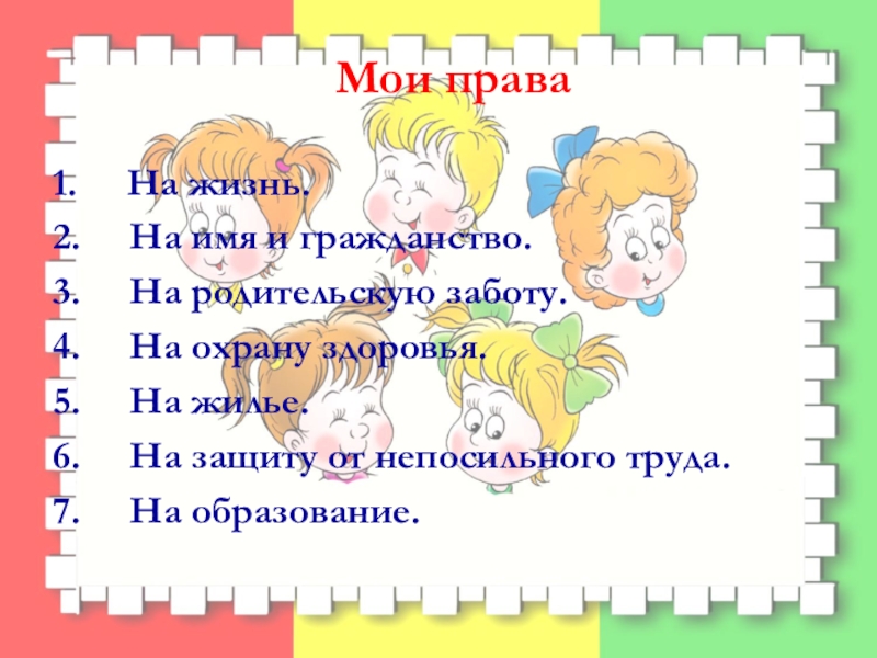 Мои права1.   На жизнь.2.   На имя и гражданство.3.   На родительскую