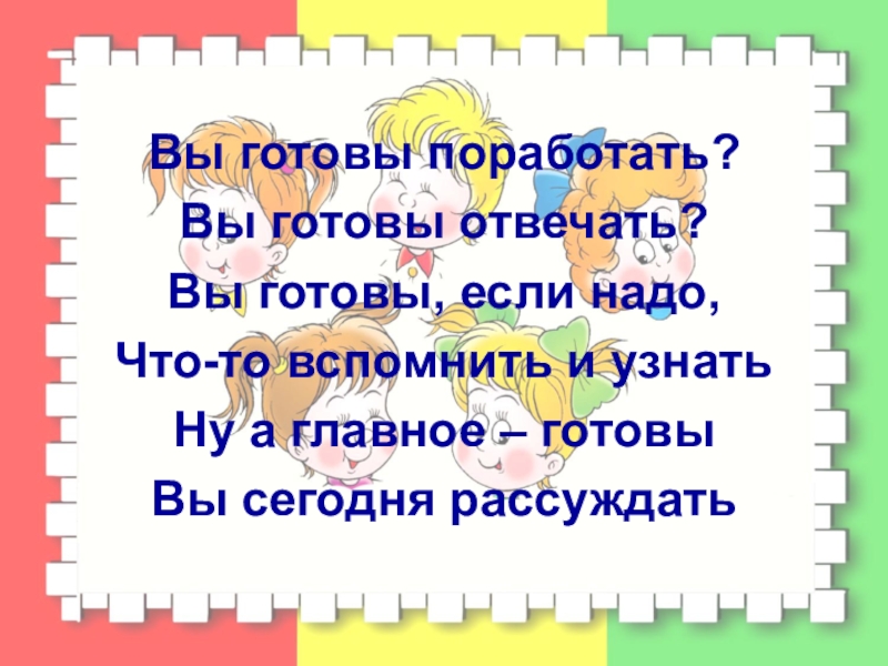 Вы готовы поработать?Вы готовы отвечать?Вы готовы, если надо,Что-то вспомнить и узнатьНу а главное – готовыВы сегодня рассуждать