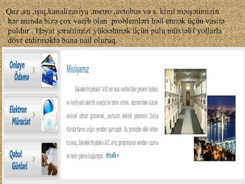 Слайд 23Qaz ,su ,işıq,kanalizasiya ,metro ,avtobus və s. kimi məişətimizin