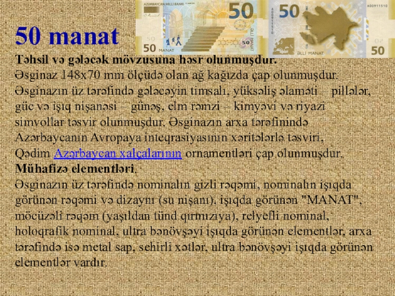 üz tərəfində ədəbi simalar, qədim kitablar, dövlət himnindən parça çap olunmuşdur. Əsginazın arxa tərəfində Azərbaycanın Avropaya inteqrasiyasının xəritələrlə təsviri verilmiş, Azərbaycanın inkişaf tarixi – Qobustan qaya heroqlifləri, Orxon–Yenisey abidələri əlifbası, müasir Azərbaycan yazısı çap edilmişdir.
