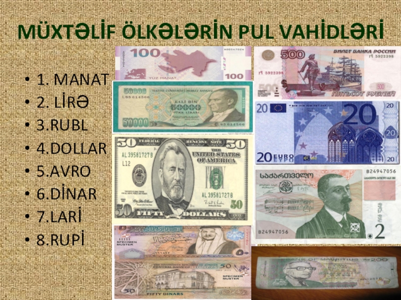 Слайд 7MÜXTƏLİF ÖLKƏLƏRİN PUL VAHİDLƏRİ