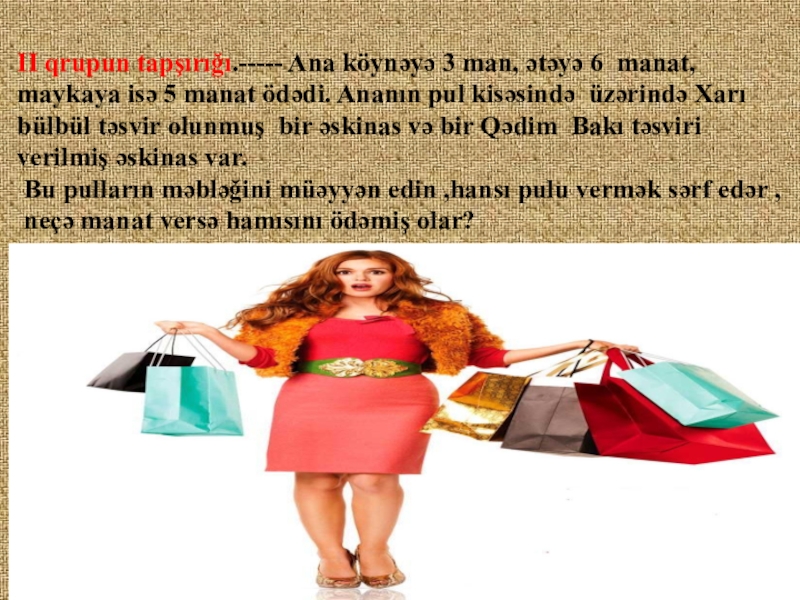 Слайд 25II qrupun tapşırığı.----- Ana köynəyə 3 man, ətəyə 6 manat,