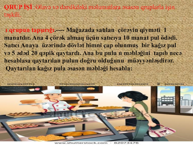 ı qrupun tapşırığı.---- Mağazada satılan çörəyin qiyməti 1 manatdır. Ana 4 çörək almaq üçün satıcıya 10 manat pul ödədi.