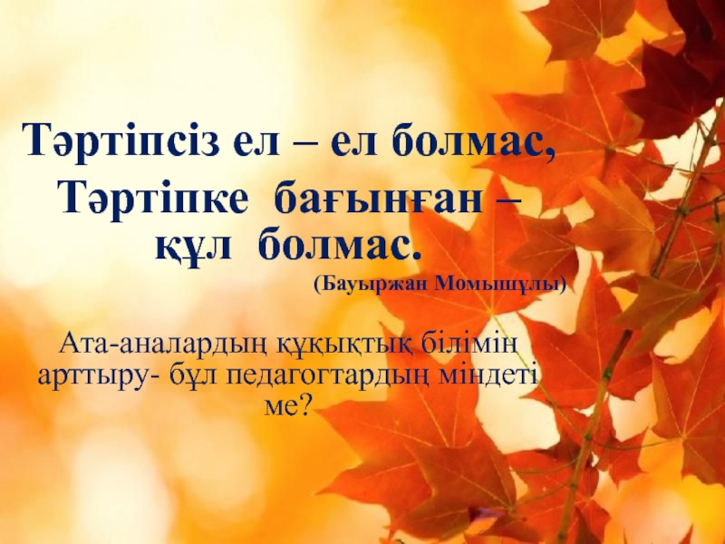 Тәртіпсіз ел – ел болмас,Тәртіпке бағынған – құл болмас. (Бауыржан Момышұлы)Ата-аналардың құқықтық білімін арттыру- бұл педагогтардың міндеті