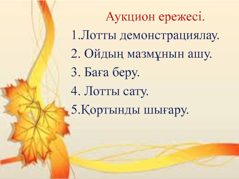Аукцион ережесі.1.Лотты демонстрациялау.2. Ойдың мазмұнын ашу.3. Баға беру.4. Лотты сату.5.Қортынды шығару.