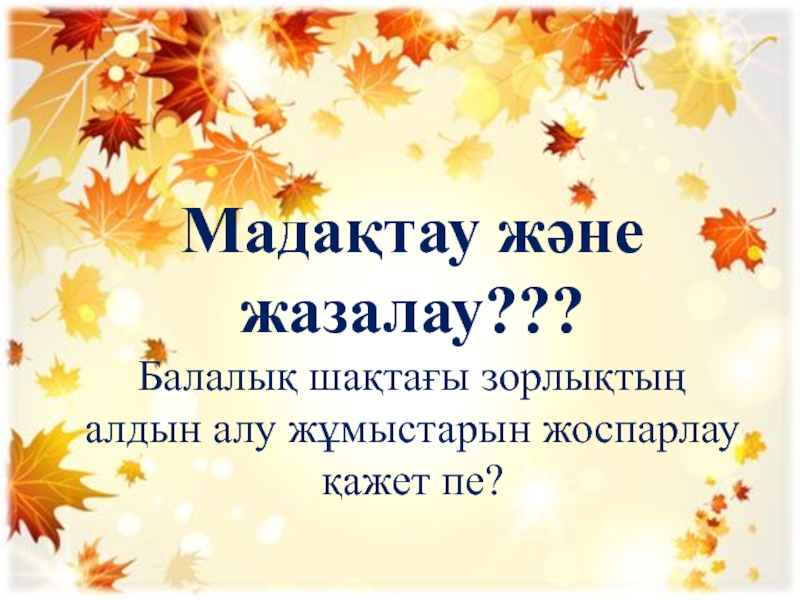 Слайд 5 Мадақтау және жазалау??? Балалық шақтағы зорлықтың алдын алу жұмыстарын жоспарлау қажет пе?