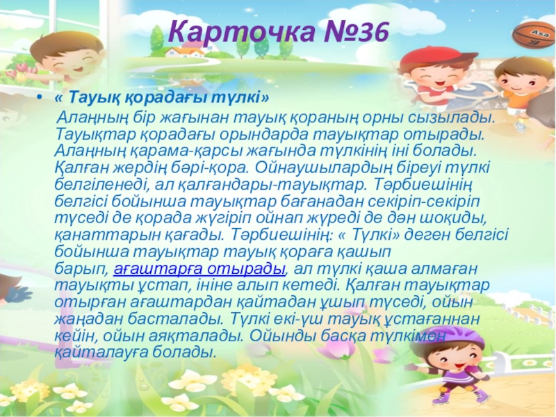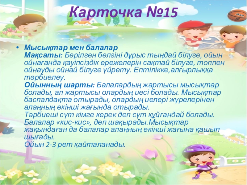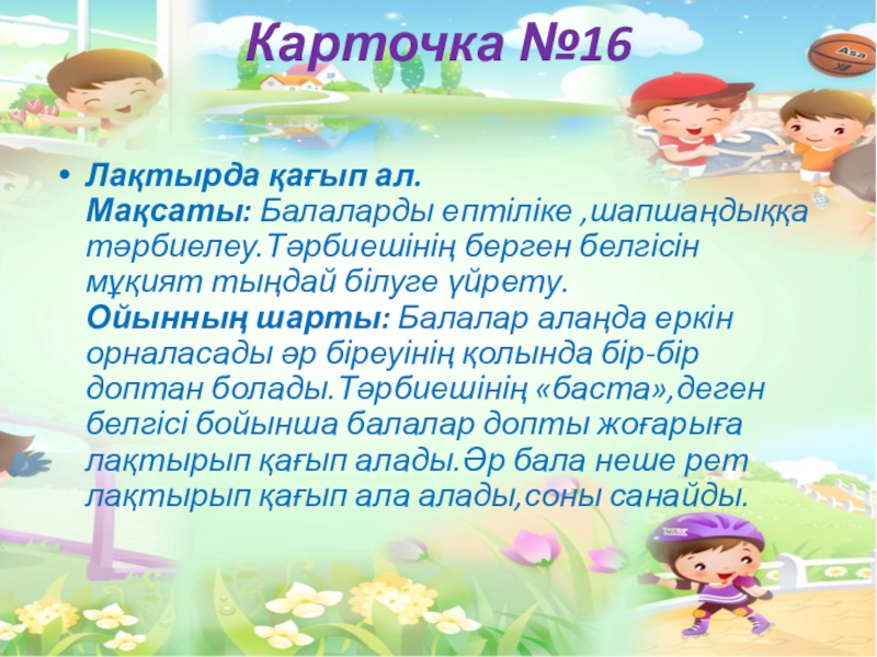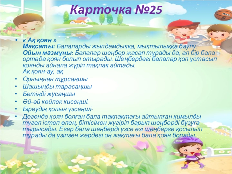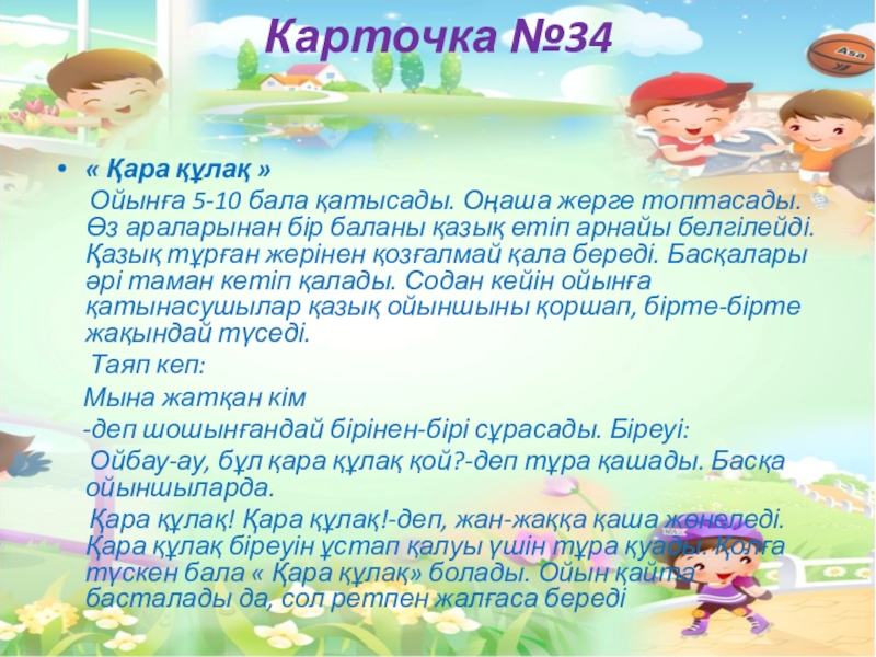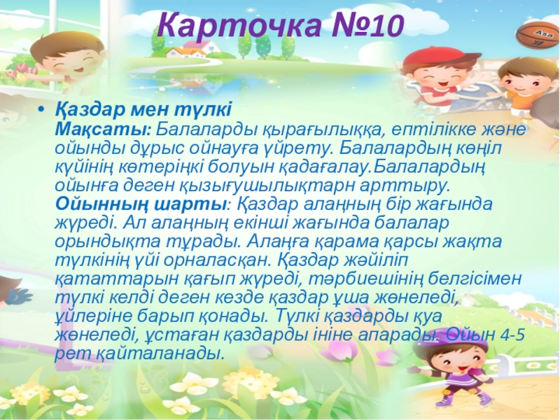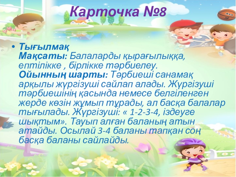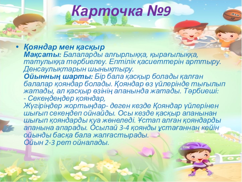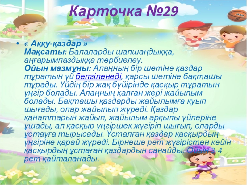 Мақсаты: Балаларды қырағылыққа, ептілікке және ойынды дұрыс ойнауға үйрету.